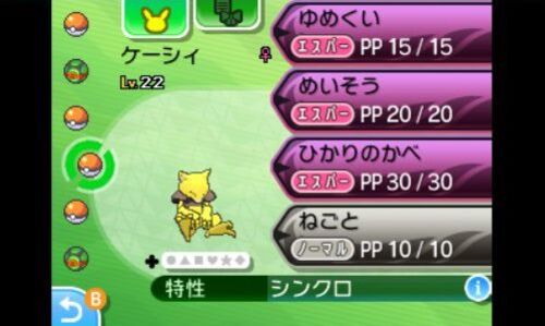 厳選で必須となる特性「シンクロ」を持つポケモン「ケーシィ」の入手方法と出現場所について分かりやすくまとめてみました。 【ケーシィの入手方法】 出現場所①:ハウオリシティ 出現場所②:2番道路(モーテルより南側の草むら) 入手方法について 用意するも…