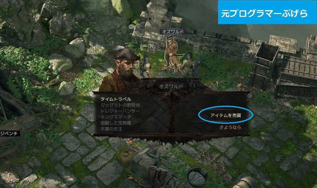 3種類の偶像を入手したら、一度タイムゲートを使って元の時代に戻り、ジッグラトの野営地の北西にいるオズワルドと会話します。 会話をしたら「アイテムを売買」を選択しましょう。